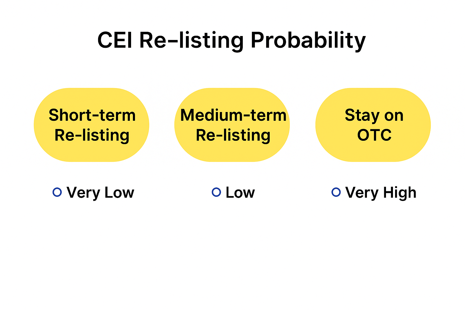 재상장은 상당히 어려운 상황입니다. NYSE나 나스닥에 재상장하려면 상장 요건을 다시 충족해야 하지만, 캠버 에너지는 이미 많은 지분 희석을 겪었고, 재무 건전성도 매우 취약합니다.