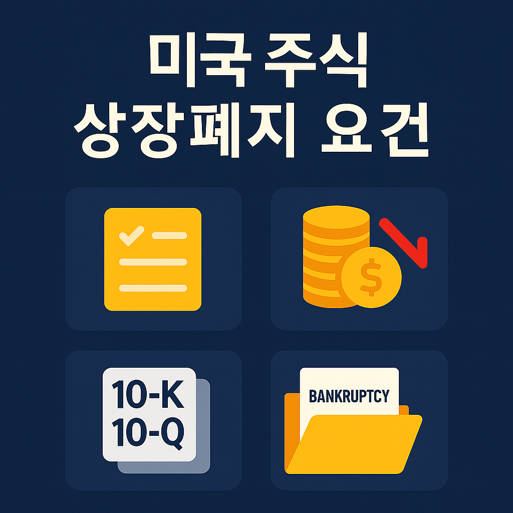 미국 주식 상장폐지 요건을 초보자도 알기 쉽게 정리했습니다. 10-K·10-Q 보고서, 1달러 룰, Chapter 7·11 파산까지 총정리합니다.